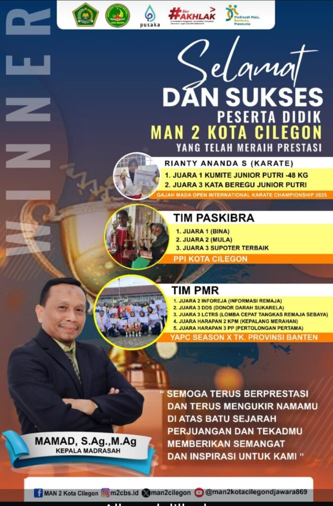 Terima kasih kepada semua pihak yang telah mendukung, komite, kepala Madrasah, Bapak dan Ibu guru, Kepala TU dan staff TU, para Pelatih serta orang tua siswa. Semoga MAN 2 Kota Cilegon terus konsisten dalam mencetak prestasi.